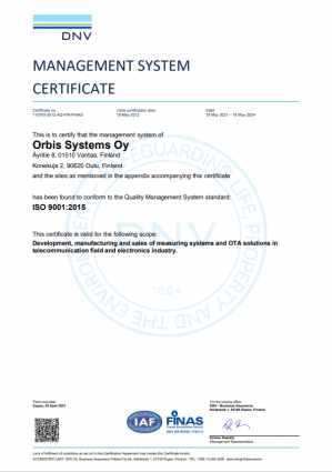 Orbis Systems is pleased to announce that the company’s operations in Finland successfully passed the recertification audit of its ISO 9001:2015 standard, demonstrating a continued commitment to delivering high quality products and services as well as consistently developing its processes. The scope of the certification includes development, manufacturing and sales of measuring systems and OTA solutions in telecommunications and electronics industries. The ISO 9001 standard is based on seven specific quality management principles, such as strong customer focus, the motivation and implication of top management, the process approach and continual improvement. In addition to Finland, Orbis Systems’ operations in China and India, Beijing Orbis Electronics CO, LTD and Orbis India, are also ISO 9001 certified.